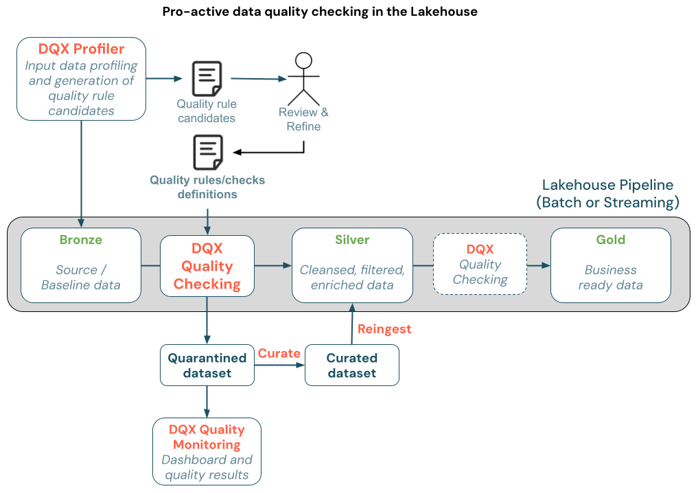 In the Lakehouse architecture, new data validation should happen during data entry into the curated layer to ensure bad data is not propagated to the subsequent layers. With DQX, you can implement Dead-Letter pattern to quarantine invalid data and re-ingest it after curation to ensure data quality constraints are met. The data quality can be monitored in real-time between layers, and the quarantine process can be automated.